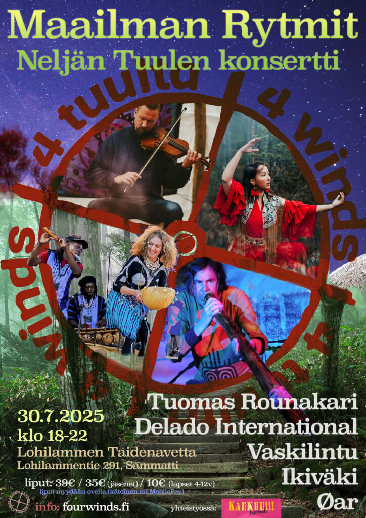 Tervetuloa ikiaikaiseen kesätapahtumaan, jossa rytmit kantavat, yhteys syvenee ja sydän muistaa oman voiman ja tanssinsa. Four Winds tuki ry kutsuu sinut Maailman Rytmit – tapahtumaan, jossa kehollisuus, kehotietoisuus, ilo, rakkaus ja yhteisöllisyys sulautuvat yhdeksi virtaavaksi rytmiksi.